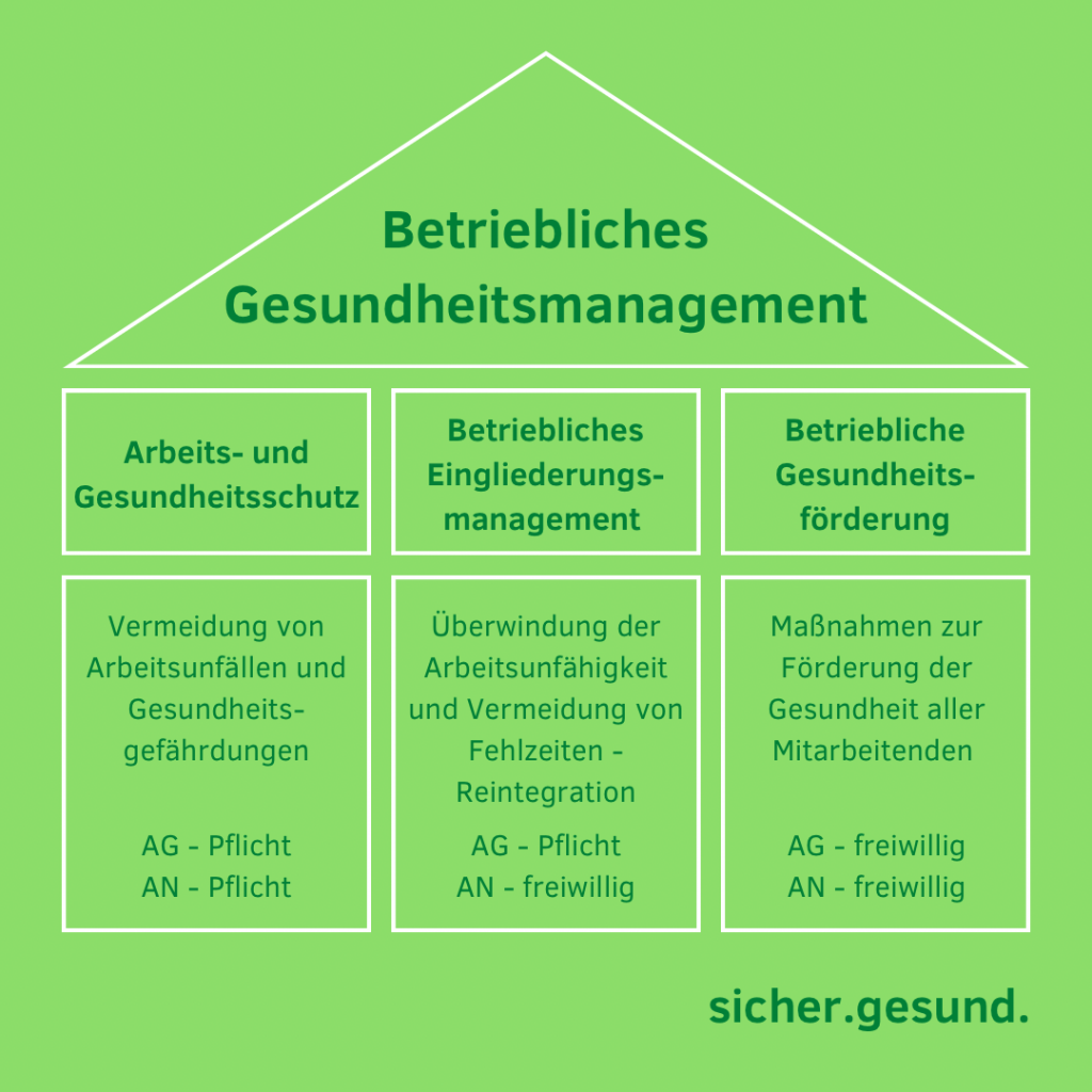 Das Betriebliche Gesundheitsmanagement besteht aus drei Säulen: dem Arbeits- und Gesundheitsschutz, dem Betrieblichen Eingliederungsmanagement (BEM) und der Betrieblichen Gesundheitsförderung (BGF).